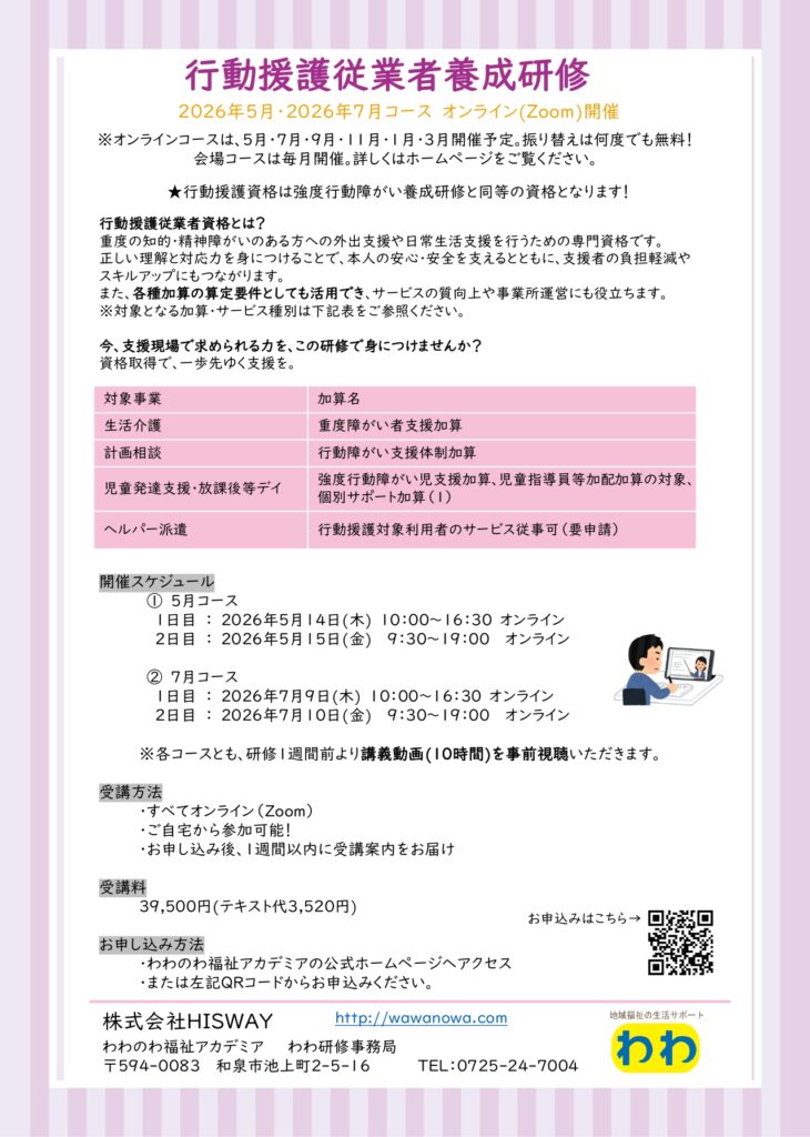 障がいのある方から配慮の申し出があった場合には、研修の目的および修了基準を損なわない範囲で、合理的配慮について対応させていただきます。